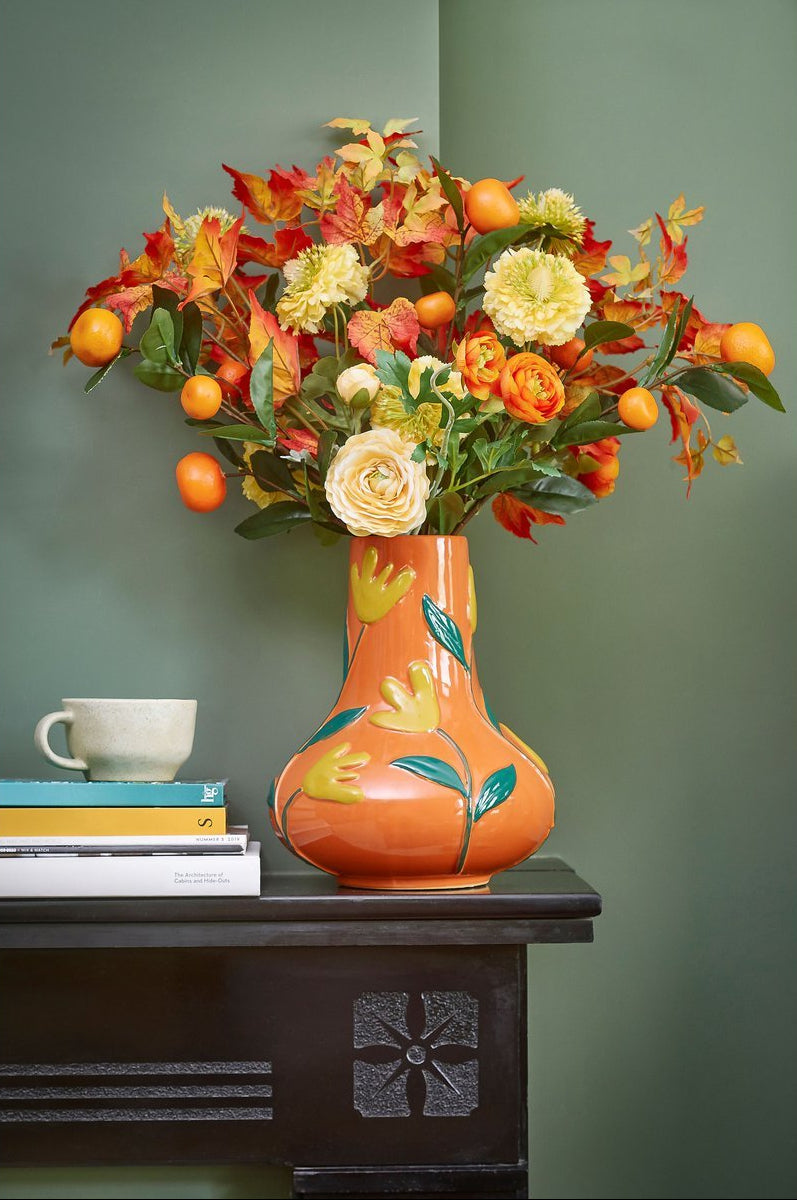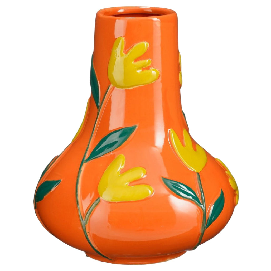 De Ava vaas valt op door de opvallende oranje kleur met bloemmotief in het geel en groen. Hij is gemaakt van stevig keramiek. De bloemenvaas is perfect voor op een tafel of dressoir met een paar losse snijbloemen, gedroogde takken of gewoon als kleurrijk statement op zichzelf. Ook leuk om te combineren met andere vazen uit de Ava collectie.