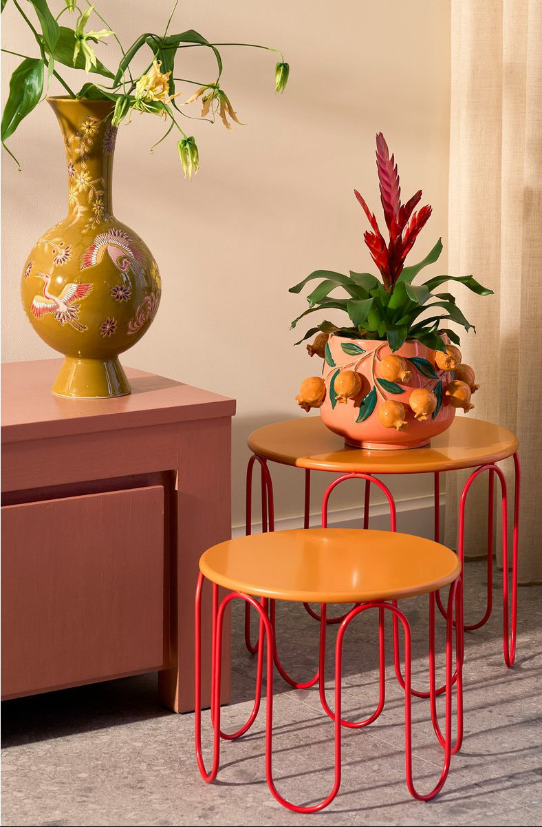 Met de Dione bijzettafel set geef je jouw interieur een gedurfd accent! Deze opvallende set van twee tafeltjes komt in een prachtige kleurencombinatie van twee verschillende tinten oranje; donkeroranje en lichtoranje. Zet ze bij elkaar als duo of verspreid ze door het huis om in verschillende ruimtes wat kleur toe te voegen.