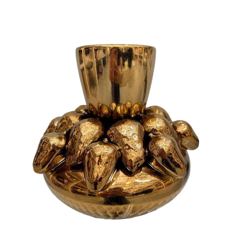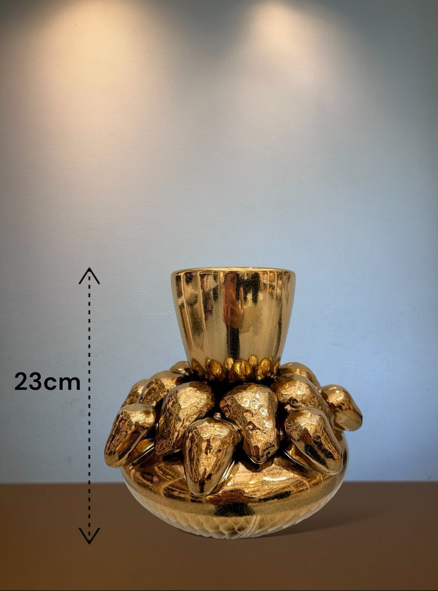 Deze goudkleurige vaas straalt luxe uit door haar prachtige glans en verfijnde reliëf van aardbeien. De decoratieve details geven het ontwerp een speelse twist, terwijl de gouden afwerking zorgt voor een chique en moderne uitstraling. Het resultaat is een stijlvol object dat direct de aandacht trekt.