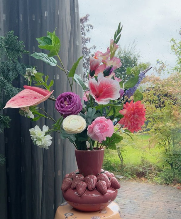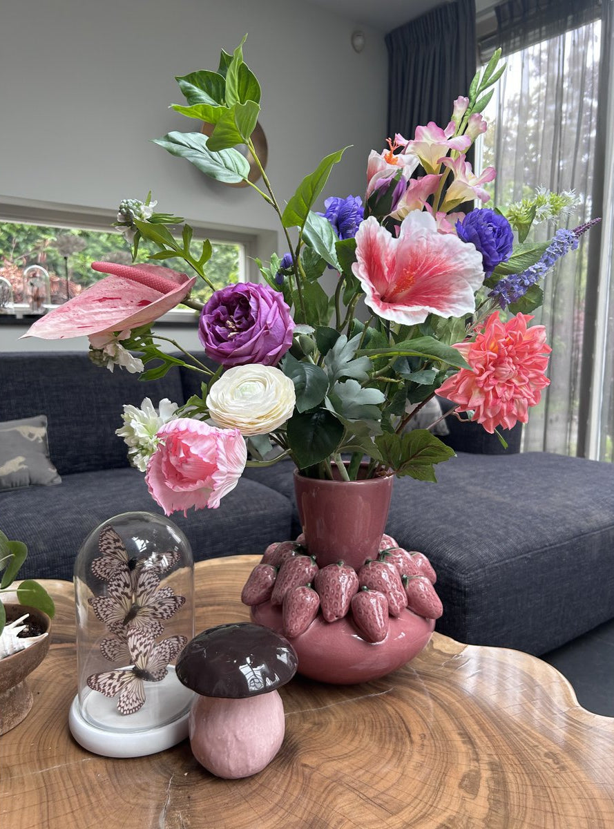 Vrolijk je interieur op met deze speelse en handgemaakte keramieken vaas. De glanzende roze afwerking en decoratieve aardbeien zorgen voor een unieke, zomerse uitstraling. Een echte blikvanger die perfect past in een eigentijds of creatief interieur.