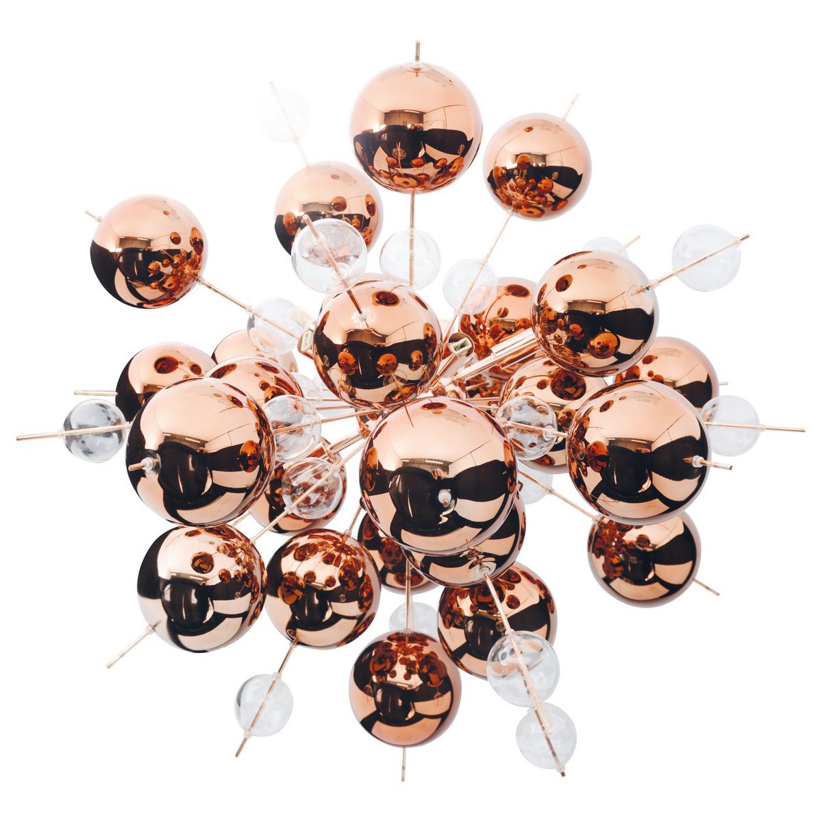 De plafondlamp Explosie doet haar naam eer aan: de beige en koperkleurige bollen lijken in beweging en trekken direct de aandacht. Dit unieke model heeft een sterk decoratief karakter en verlicht de kamer op een aangename en veelzijdige manier.