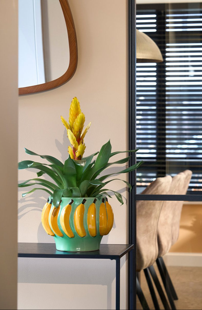 Ben je op zoek naar een frisse en unieke variatie van de welbekende fruit vaas? Dan is de Moza bloempot een goed alternatief! Met zijn lichtgroene basis en vrolijke gele bananen in de afwerking is deze keramieken bloempot een echte blikvanger. Hij is handgemaakt van keramiek en bestand tegen water. Verder biedt hij ruimte voor een kweekpot met een diameter van 17 cm. Ideaal om je planten een bijzonder podium te geven in de woonkamer, keuken of op een bijzettafel.